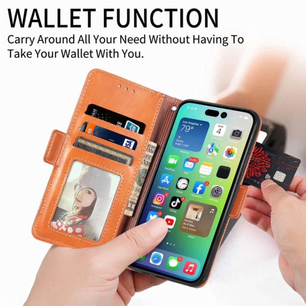 Ihr iPhone 14 ist mit dieser Lederhülle im Retro-Stil, die als Portemonnaie dient, sehr gut gesichert.