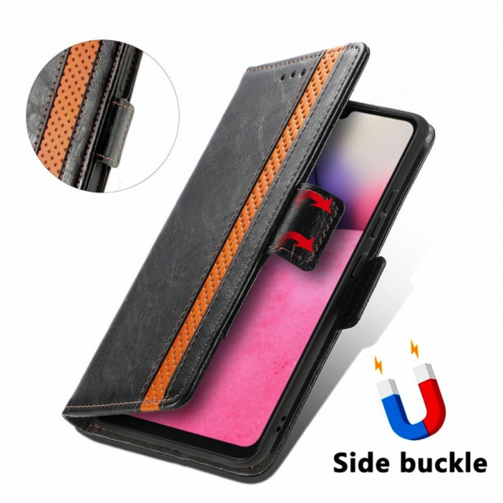 Die zweifarbige Kunstledertasche für Ihr Samsung Galaxy A33 5G ist mit Schutz, Kartenfächern und einem Doppelverschluss ausgestattet.