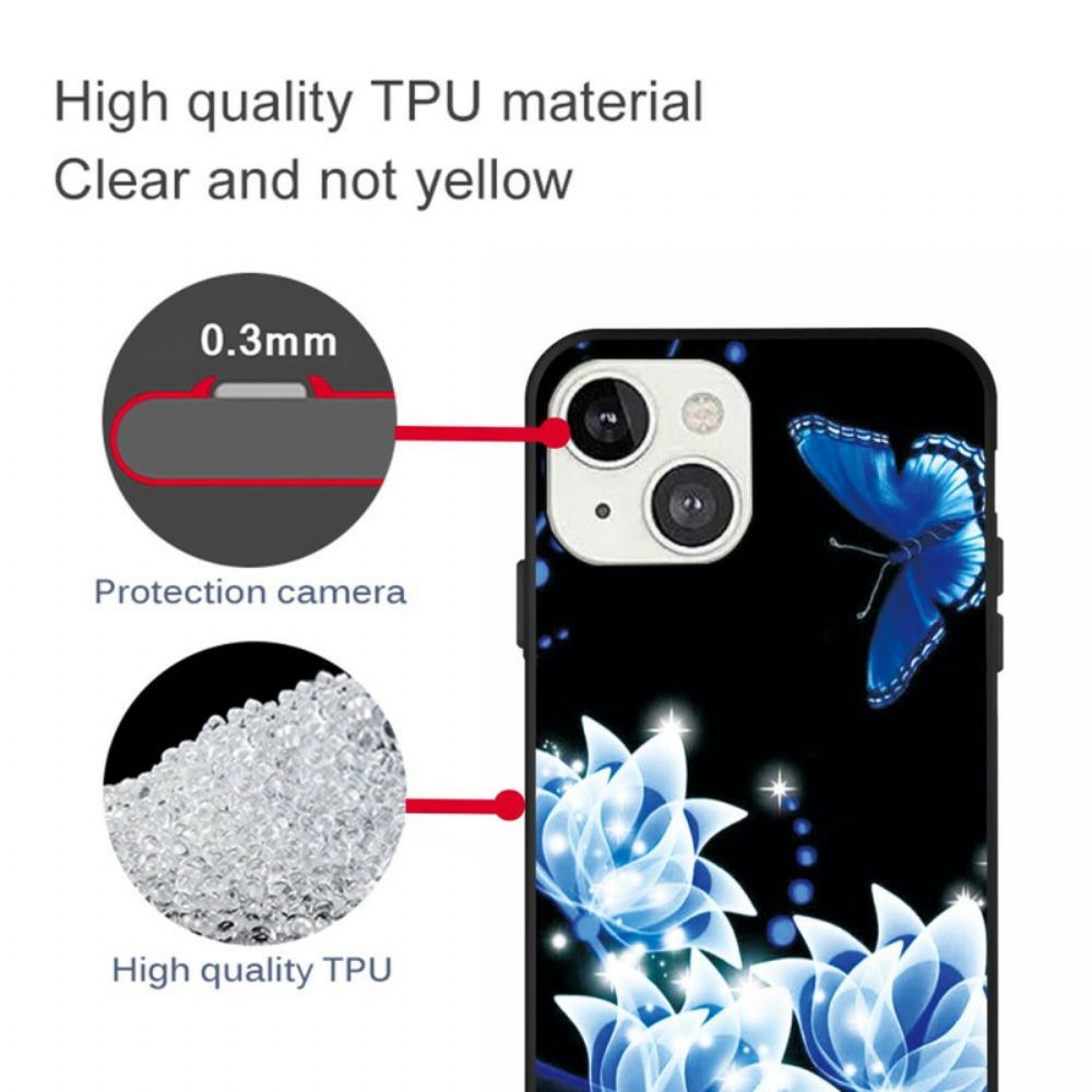 Schützen Sie Ihr wertvolles iPhone 13 Mini mit dieser einzigartigen Silikonhülle mit Schmetterling und blauen Blumen.