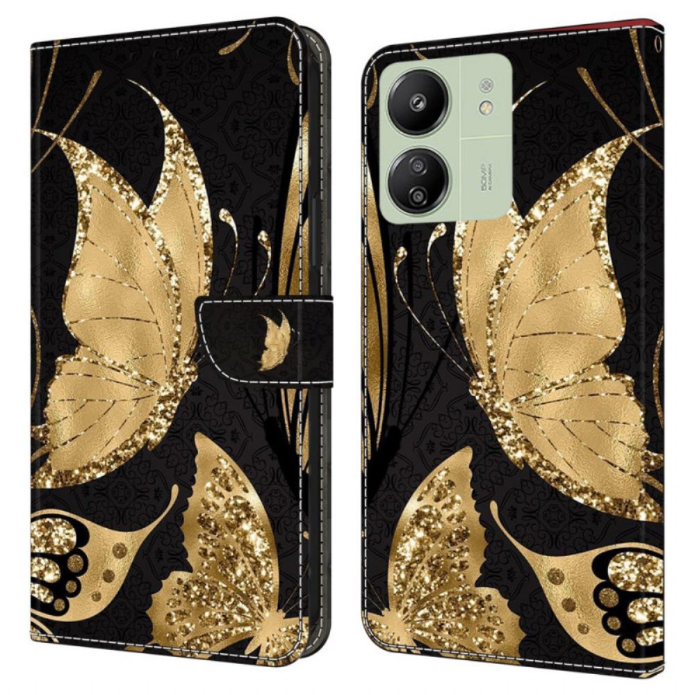 Lederhüllen Für Poco C65 Goldener Schmetterling Auf Schwarzem Hintergrund