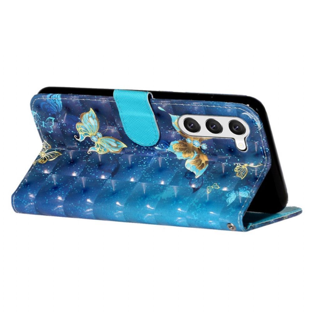Lederhüllen Für Samsung Galaxy S24 5g Blaue Und Goldene Schmetterlinge Mit Schlüsselband