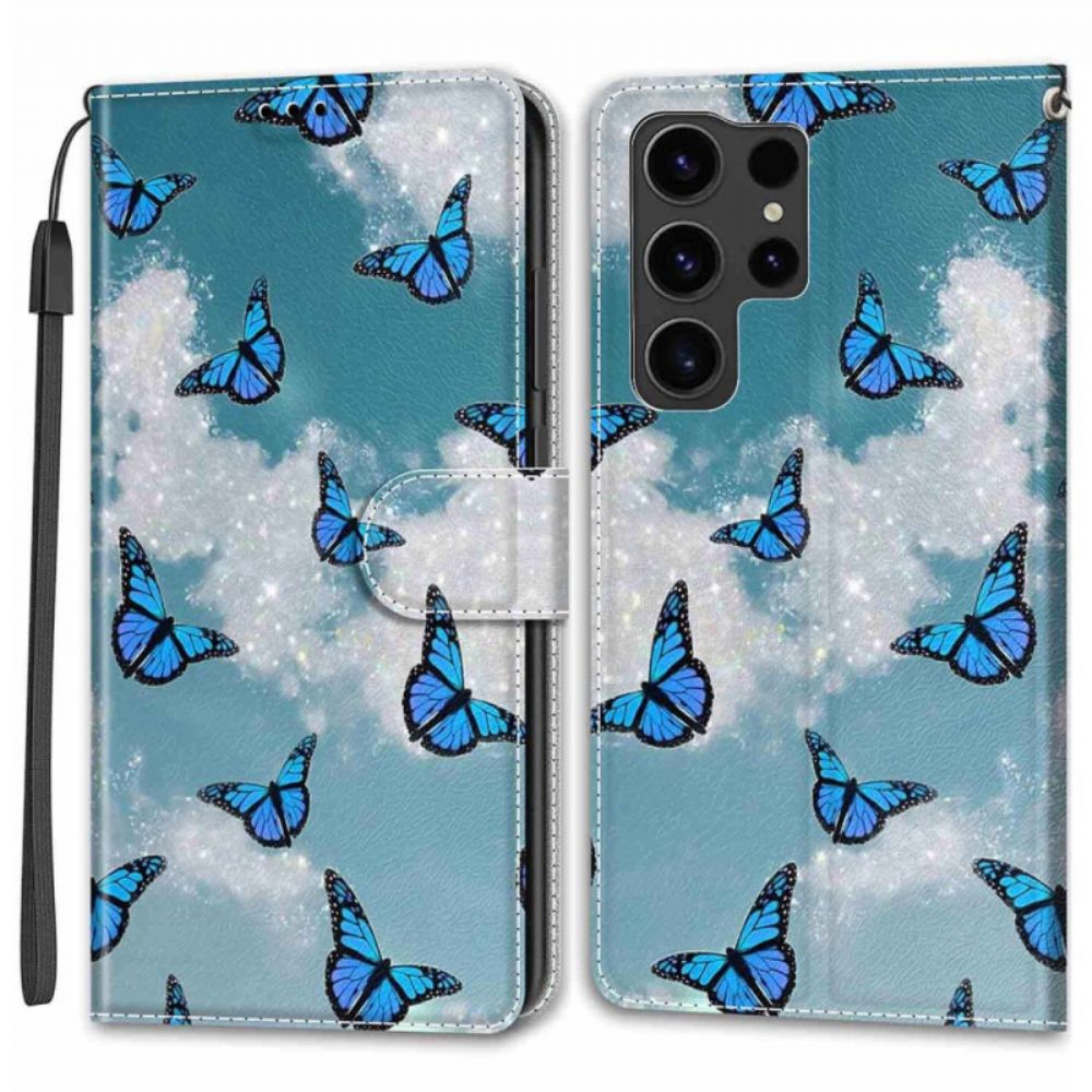 Lederhüllen Für Samsung Galaxy S24 Ultra 5g Weiße Wolken Und Blaue Schmetterlinge Mit Riemen